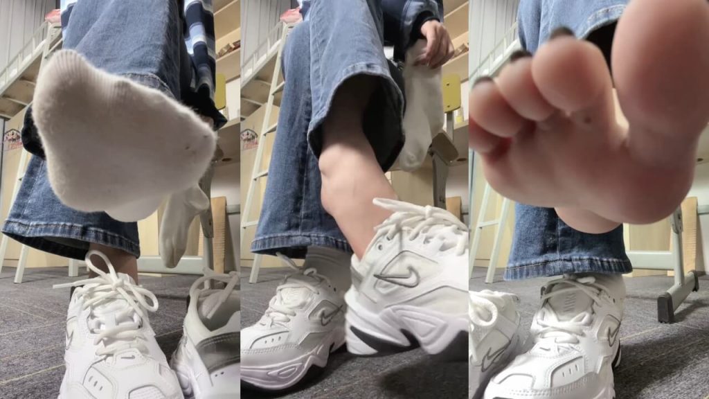 绘子穿到到袜底发黑的白棉袜,