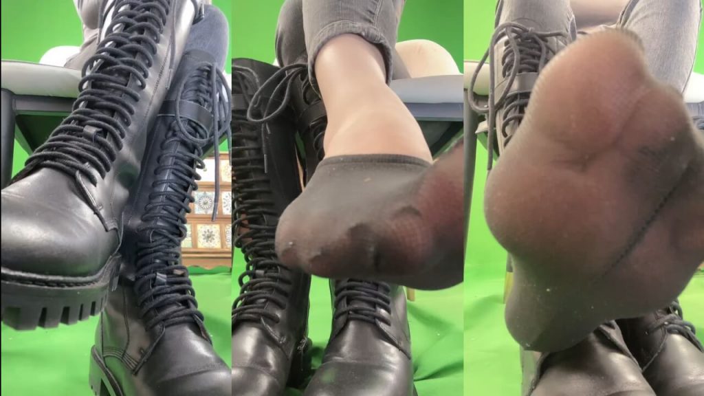 绘子 – 绿幕前皮靴黑船袜裸足